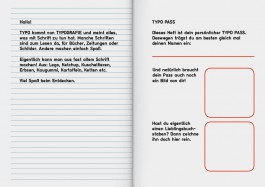 Eine kleine Publikation die Kindern spielerisch das Thema »Typografie« näher bringt. Auf jeder Seite gibt es ein neues Kapitel und eine neue spannende Aufgabe. Der Typo Pass war kostenlos erhältlich im Rahmen der Ausstellung ON–TYPE: Texte zur Typografie.